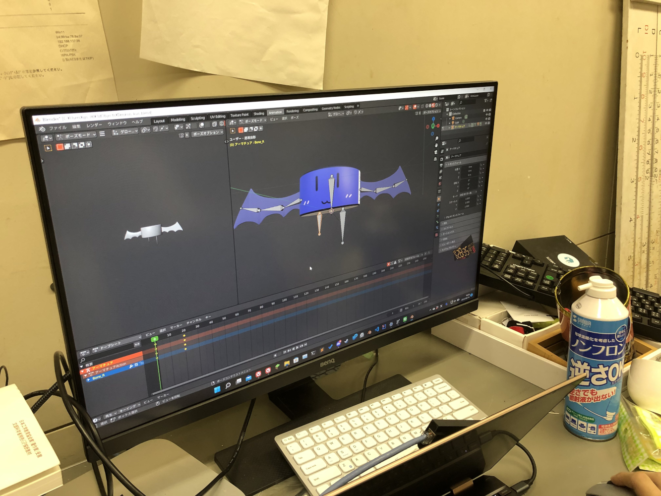3Dモデルにアニメーションを付けるときには"骨"と呼ばれるものを付ける必要があるのですが,それを付けて動かしたときに,動かしたいところ以外も連動して動いてしまいがちで大変でした. あと,そもそもアニメーションを作るのが初めてで,自然な動きをつけられなかったことも挙げられます.